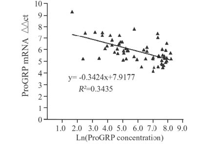 采用直线相关的方法对外周血ProGRP mRNA 的ΔCt值和血清ProGRP蛋白进行相关性分析,结 果显示两者之间存在着直线负相关(r=-0.586, P<0.001),见图2,间接说明ProGRP mRNA表达水 平与血清ProGRP呈正相关。