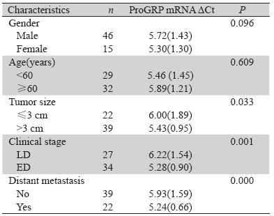 SCLC患者外周血ProGRP mRNA表达水平与性 别、年龄无相关性,差异无统计学意义(P>0.05); 而与原发肿瘤大小、临床分期及远处转移均有相 关性,其差异有统计学意义(P<0.05)。ED期患者 ProGRP mRNA表达水平明显高于LD期患者,有转 移患者的ProGRP mRNA表达水平较高,见表 1。