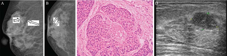 ![]() | 图 1 同一DCIS患者的乳腺数字钼靶、病理及CDUS图Figure 1DM,HE image and CDUS image of the same breast lesionA:cranio-caudal (CC) view;B:medio-lateral oblique (MLO) view;A,B:isodense lesion with irregular shape and margin infi ltration. Microcalcifi cation spots in focus are demonstrated in the lesion (white arrow);C:HE image( ×100 magnification) of sections of the lesion;D:US image shows a hypoechoic lesion in the breast ductal. Microcalcifi cations may be seen in the lesion (white arrow) |