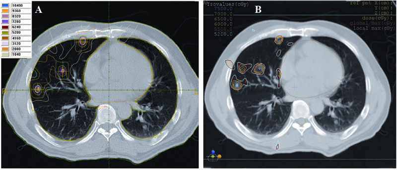 一般认为恶性肿瘤发生肺转移,治疗应该以 全身治疗(如化疗)为主。对孤立肺转移灶, 采用局部治疗手段清除可见病灶,将有利于提 高疗效。肺转移瘤手术切除后的5年生存率可达 34%~36% [8]。放疗是肺转移瘤治疗的另一个局部 治疗手段,然而,对孤立肺转移灶采用常规放疗 技术照射,会使正常肺组织较多卷入高剂量区 内,造成不必要的放射性肺损伤,影响患者的生 活质量。