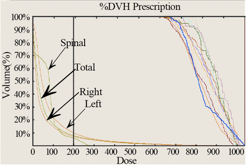 ![]() | 图4 一个俯卧体位病例的伽玛刀DVH Figure 4 DVH of γrays radiotherapy for a prone case |
