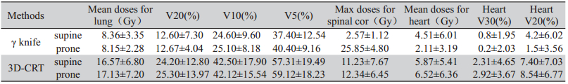 不论采用仰卧体位还是俯卧体位,γ刀治疗都 能很好的保护患者的肺、心脏和脊髓,见图 1~4、表 1。
