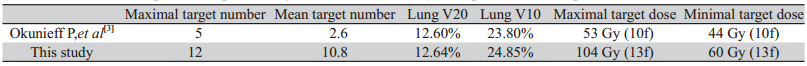 本文采用OUR-QGD型体部γ刀,针对肺多发 转移瘤患者设计γ刀治疗计划。结果显示γ刀能将 高剂量集中到靶区周围,即使靶区之间距离较 近,靶区外也没有出现剂量热点,在很好地保护 肺、心脏和脊髓等正常组织的同时,能够给予靶 区较高剂量。其中有些病例,由于正常组织得到 很好保护,还有提高靶区剂量和同时治疗靶区数 目的潜力,充分显示了γ刀多源旋转剂量聚焦的优 势。Okunieff等[3]采用基于加速器X刀的SBRT技术 治疗肺多发转移瘤患者,表 2是他们的剂量学数据 和本文的比较。显示采用体部γ刀单个疗程同时可 以治疗更多靶区,肺的受照剂量相当,靶区的最 小和最大剂量还有优势。