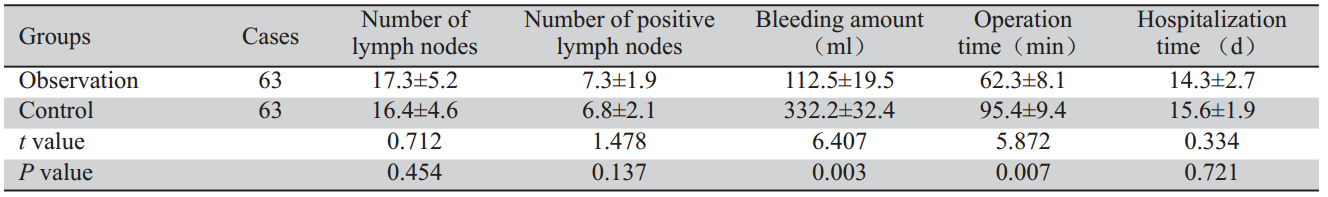 两组淋巴结清扫个数、阳性淋巴结数、手术 出血量、手术时间和住院时间等指标,见表 1。其 中两组淋巴结清扫个数、阳性淋巴结数和住院时 间两组数据间差异无统计学意义(P>0.05),手术 出血量及手术时间均少于对照组,差异有统计学 意义(P<0.01)。