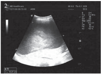 图 2 肝包膜下巨大囊性转移瘤患者腹部B型超声 Figure 2 Abdominal US of huge cystic metastatic tumor of hepatic subcapsular The huge cystic mass under the liver capsule,the maximum anteroposterior diameter is 16.3cm×9.5cm |