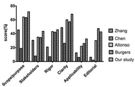 图 1本文与Chen、Alonso-Coello、Zhang、Burgers研究的指南质量的比较 Figure 1Comparison of the quality of the guidelines included in this report with those included by Chen, Alonso-Coello, Zhang and Burgers |
