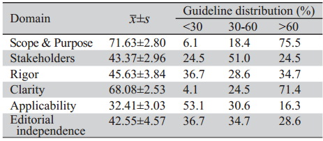 表 2 指南得分及各领域得分分布情况 Table 2 Guideline score (x±s) and Guideline distribution (%) according to scores in each domain assessed by the AGREE II instrument |