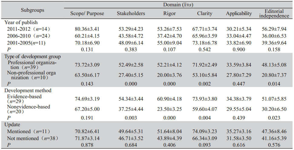 根据发表年限(2001-2005,2006-2010, >2010)、指南制定机构类型(专业机构与非专业 机构)、更新与否、制定的方法学(基于循证医 学、未基于循证医学)对纳入的指南的各领域得 分进行亚组分析,见表 3。