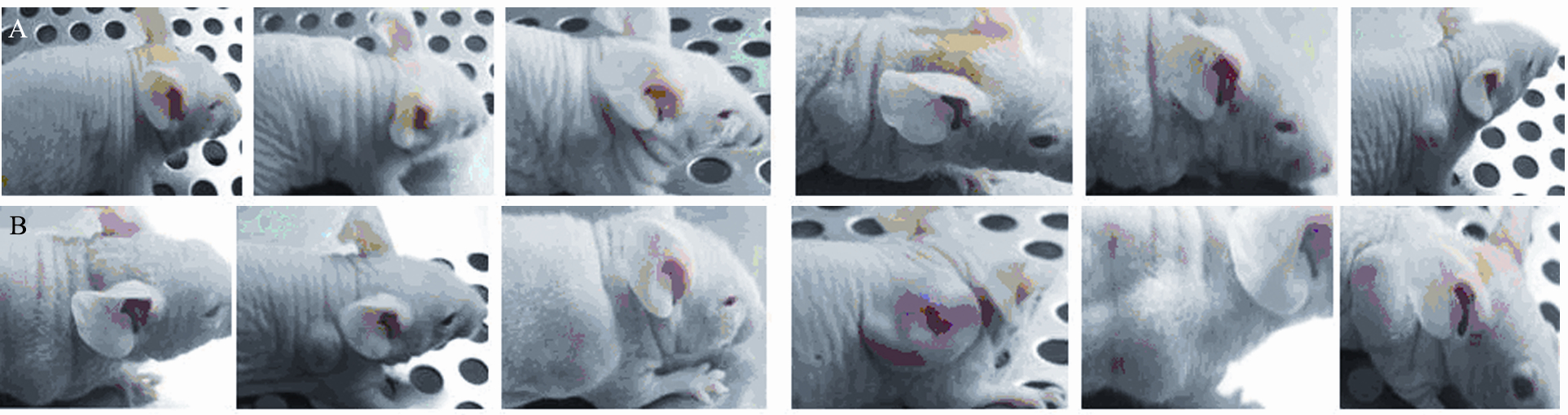 建立肿瘤模型应首先解决宿主动物的免疫排 斥反应。BALB/C裸鼠,是已被国际上认可的实验 动物[ 13 ]。该种小鼠无胸腺,缺乏免疫反应,属于 免疫缺陷动物。裸鼠体内细胞较接近人体内细胞 的情况,接种肿瘤细胞成活率较高。该移植瘤模 型能够很好地观察人体内肿瘤细胞的自然生长情 况。肿瘤表浅易于记录观察,且能完整的保持原 发瘤的生物学特征。