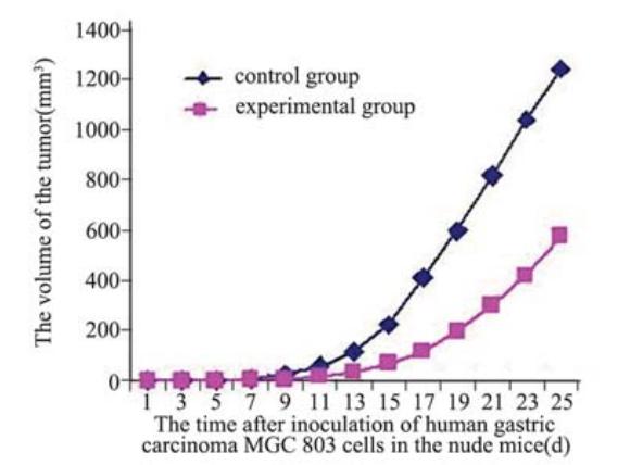接种人胃癌MGC 803细胞的第10天(即开始 给予15d-PGJ2第4天后),两组裸鼠移植瘤体积逐 渐出现变化,第12天,实验组裸鼠移植瘤平均体 积为(25.01±11.24)mm3,对照组裸鼠移植瘤平 均体积为(79.39±59.09)mm3。第14天开始,实 验组的裸鼠移植瘤体积(47.75±18.50)mm3显著 低于对照组(167.07±108.07)mm3,生长速度明 显慢于对照组,差异有统计学意义(P<0.05),其皮 下移植瘤明显小于对照组裸鼠,见图1。实验结 束时(即给予15d-PGJ216次后的第3天;即接种 人胃癌MGC 803细胞的第25天)实验组和对照组 肿瘤体积分别为(573.86±242.90)mm3和(1206.46 ±272.22) mm3,前者明显小于后者(P<0.05), 15d-PGJ2对实验组裸鼠移植瘤的体积抑制率为(53.71 ±5.8)%。以接种胃癌MGC 803细胞天数为横坐标, 测量并计算肿瘤体积为纵坐标,绘制肿瘤生长曲 线,见图2。从肿瘤生长的曲线可以看出,随着 15d-PGJ2作用时间的延长,两组曲线升高趋势和 速度出现变化,即实验组的裸鼠肿瘤生长受到抑 制。从每天测量裸鼠体积的数据也可计算出对照 组和实验组裸鼠皮下移植瘤的平均体积。