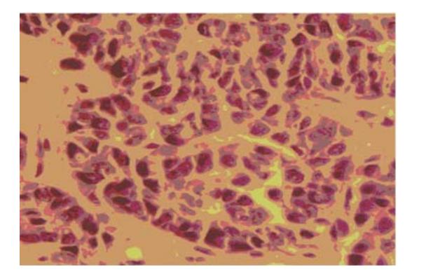 光学显微镜下可见移植瘤细胞有明显异型 性,细胞大小不一,细胞核大小、形状及染色不 一,核分裂相易见,为低分化腺癌,瘤组织部分 区域内可见坏死,见图3。另裸鼠肝脏、肾脏和脾 脏在光镜下,没有观察到任何损伤的表现。
