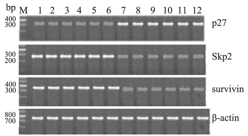 图4 RT-PCR检测的裸鼠皮下移植瘤组织中p27 、Skp2、 survivin mRNA的表达 Figure 4 Expressions of p27, Skp2 and survivin mRNA of subcutaneous xenograft tumor of nude mice detected by RT-PCR |