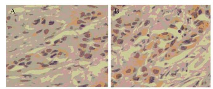 采用标准非生物素辣根过氧化物酶(NONBIOTIN HRP)免疫组织化学两步法(ZYMED)。用 橘橼酸缓冲液(0.01M,pH6.4)在800W微波炉热 抗原修复12min。鼠抗人单克隆抗体CD44(1:80 稀 释,Santa Cruz) 4℃孵育过夜。DAB显色,苏木精 对比染色细胞核。每次以PBS代替一抗作为阴性对 照。用已知阳性的切片作为阳性对照。在光学显 微镜下,对每张切片在高倍镜(×400)下计数15 个视野。CD44以细胞质出现棕黄色颗粒为阳性。 在肿瘤处选取CD44染色好的区域,至少10个高倍 镜视野(×400),计数1 000个细胞,计算阳性细胞 所占的百分率,作为CD44的阳性率(%),阳性 率(%)=阳性细胞数/总细胞数×100%,每例标本 重复三次,取其平均值。 1.6 统计学方法