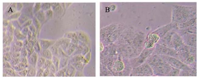 转染pcDNA3.1(+)-X株(即HepG2X细胞株)及转 染空载体的HepG2细胞(即HepG2X0细胞株)经G418 筛选后,两周后形成细胞克隆,见图1,而未转染 的细胞株死亡。HepG2X0及HepG2X细胞均形成细 胞克隆,但后者凋亡小体明显增多。