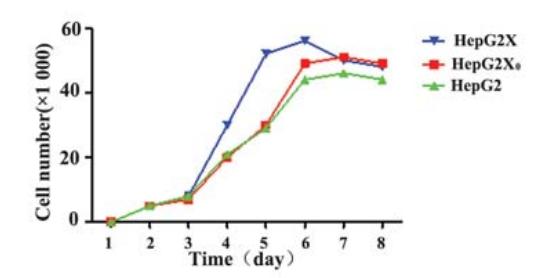 图3 HepG2、HepG2X0、及HepG2X三株细胞生长曲线图 Figure 3 Cells growth curves of HepG2, HepG2X0and HepG2X stains |