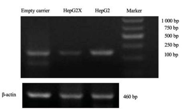 约200 bp处可见p21mRNA的PCR产物片段, HepG2X较其他两组细胞p21mRNA水平明显减 低,见图7。