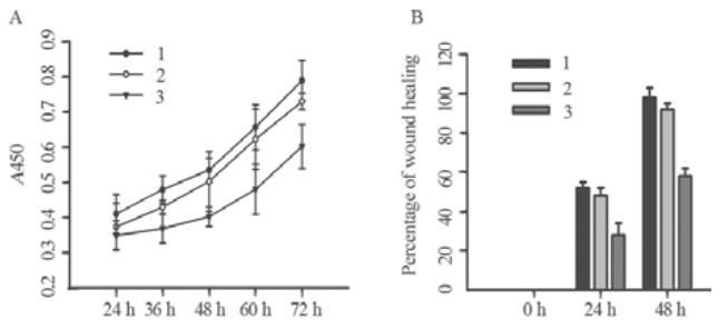 A:CCK-8 cell proliferation assay;B:cell scratch wound healing assay;1: