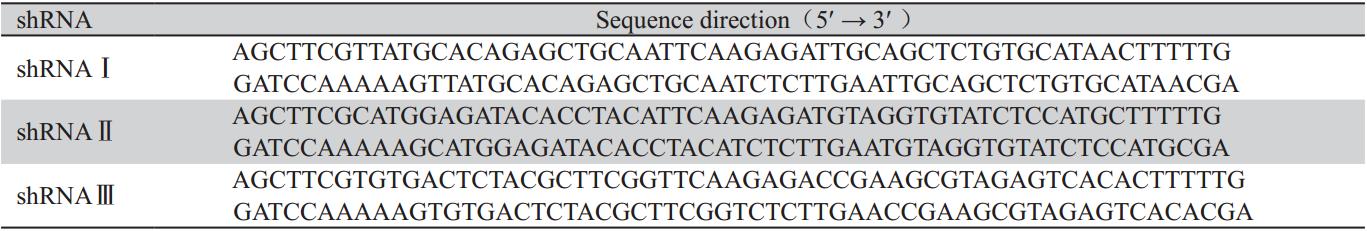 根据GenBank提供的E6/E7基因序列,使用 美国Ambio公司在线设计软件,通过基因序列比 对,挑选3条长度均为19个碱基的特异性寡核苷酸 序列(5'-GTTATGCACAGAGCTGCAA-3';5'-GCA TGGAGATACACCTACA-3';5'-GTGTGACTCTA CGCTTCGG-3'),人工合成E6/E7基因的shRNA寡 核苷酸,具体序列见表1。将这两段互补的寡核苷 酸退火,形成具有黏性末端的互补双链。运用限 制性内切酶HindⅢ和BamHⅠ对表达载体psilencer 2.1-U6 hygro进行酶切纯化回收,并在T4 DNA连 接酶的作用下将其与退火后的双链DNA 22℃4 h定 向连接,连接产物转化感受态大肠埃希菌DH5α, 涂布氨苄青霉素抗性平板后挑取阳性克隆,送上 海英骏生物技术有限公司测序。鉴定正确的阳性 克隆分别命名为psilencer 2.1-U6 hygro-shE6/E7Ⅰ、 psilencer 2.1-U6 hygro-shE6/E7Ⅱ、psilencer 2.1-U6 hygro-shE6/E7Ⅲ。
