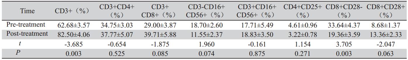 对比治疗前及最后一个周期免疫治疗后2月 的T细胞亚群变化发现,CD3+、CD3+CD4+、 CD3+CD8+、D3+CD16+CD56+、CD8+CD28+ 百分比有明显上升,CD3-CD16+CD56+、 CD4+CD25+、CD8+CD28-百分比有明显下降,但 只有CD3+和CD8+CD28-的变化P值小于0.05,差 异有统计学意义,见表2。