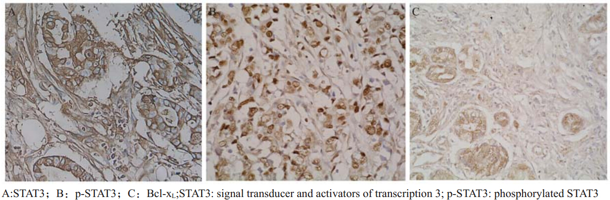 鼠抗人STAT3多克隆抗体、羊抗人p-STAT3多克隆抗体购自美国Santa Cruz公司;兔抗人Bcl-xL多克隆抗体购自北京博奥森生物技术有限公司;生物素标记的二抗、SP检测试剂盒及DAB显色试剂盒购自北京中杉金桥生物技术有限公司。采用免疫组织化学SP法染色,所有标本经10%福尔马林固定,石蜡包埋,以4 μm厚连续切片,进行脱蜡水化,3%过氧化氢消除内源性过氧化物酶20 min,PBS冲洗,微波抗原修复10 min,再PBS冲洗,正常山羊血清室温下封闭15 min,滴加一抗(鼠抗人STAT3多克隆抗体、兔抗人Bcl-xL多克隆抗体工作浓度均为1:500,羊抗人p-STAT3多克隆抗体工作浓度为1:400),4℃冰箱过夜,PBS冲洗后加入生物素标记二抗(工作浓度1:100),37℃孵育30 min,PBS冲洗后滴加辣根过氧化物酶37℃孵育30 min,PBS冲洗,DAB显色,流水冲洗10 min,苏木精对比染色,脱水、透明,中性树胶封片,镜检。用已知阳性表达的组织切片作为阳性对照,用PBS缓冲液代替一抗作为阴性对照。1.3 结果判断