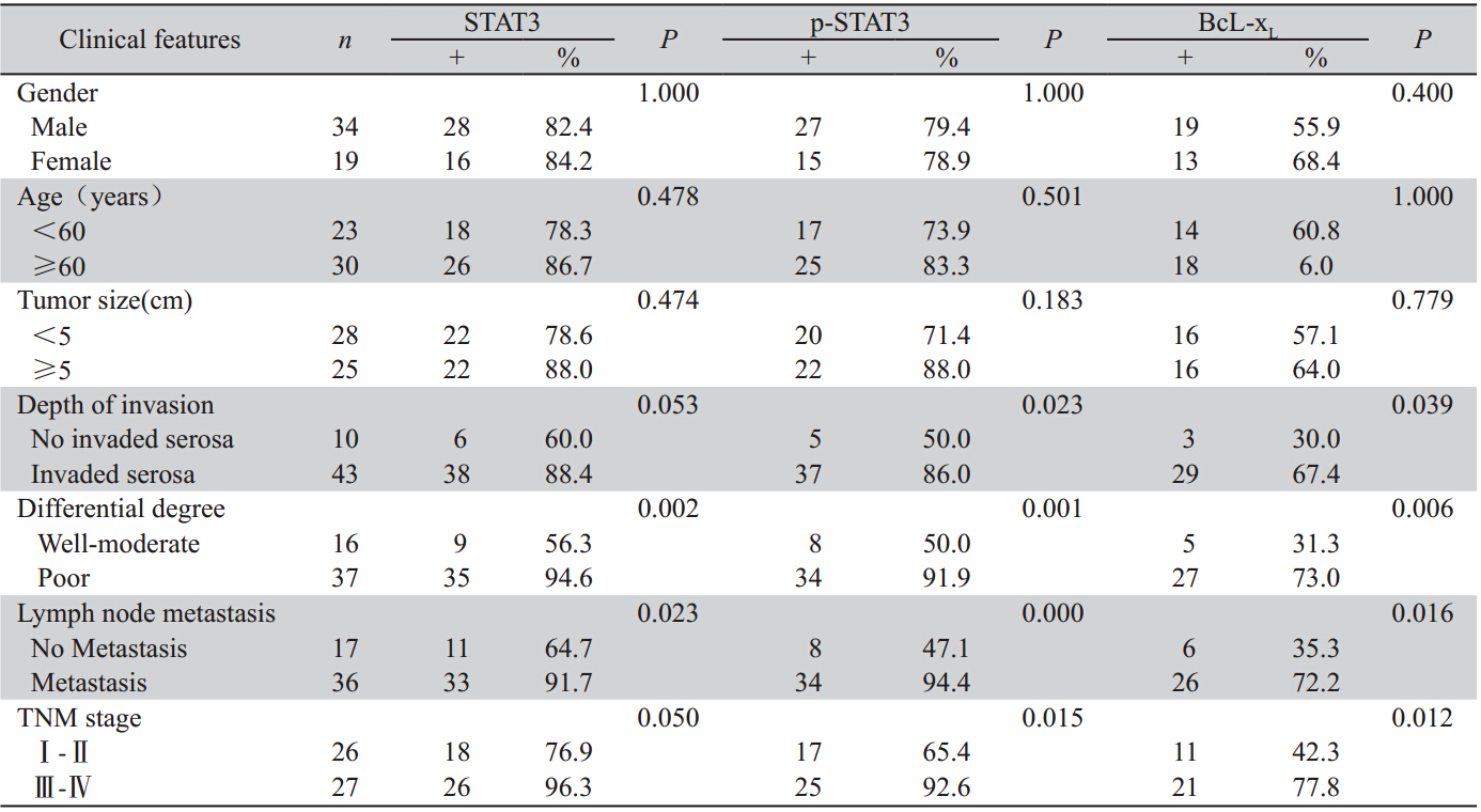胃癌组织中STAT3蛋白在低分化组和有淋巴结转移组中表达分别高于高中分化组和无淋巴结转移组,差异均有统计学意义(P<0.05);随着浸润深度加深及临床分期增高而表达有增高趋势,但组别间差异无统计学意义(P值分别为0.053和0.050)。p-STAT3、Bcl-xL蛋白在胃癌组织中的表达随着浸润深度加深、分化程度降低、发生淋巴结转移及临床分期增高而表达增高,组别间的差异均有统计学意义(P<0.05)。胃癌患者不同性别、年龄及肿瘤大小各组组间STAT3、p-STAT3、Bcl-xL 蛋白的阳性表达率比较,差异均无统计学意义(P>0.05),见表1。