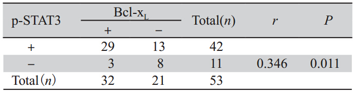 胃癌组织中p-STAT3蛋白表达与Bcl-xL 蛋白的表达呈正相关(r=0.346,P=0.011),见表2。