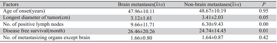 表2 晚期乳腺癌患者脑转移危险因素: 连续变量的单因素分析结果 Table 2Univariate analysis of risk factors for brain metastases from advanced breast cancer: continuous variables |
