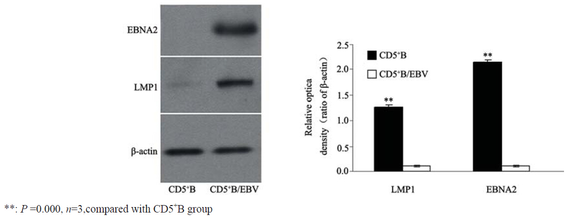 用Akada EBV感染CD5+B后,经过G418 筛选, Western blot结果与CD5+B细胞比较,CD5+B/EBV 细胞中LMP1和EBNA2蛋白相对表达显著增高 (P=0.002,P=0.000),见图 2。