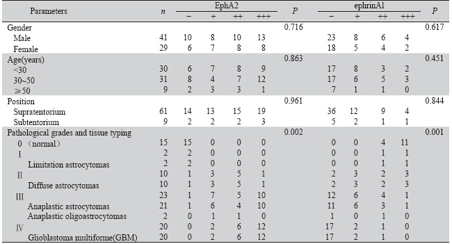 表 1 星形胶质细胞瘤标本EphA2和ephrinAl免疫组织化学染色评分与临床病理学特征的关系 Table 1Relastionship of EphA2 and ephrinA1 IHC scores and clinicopathologic parameterss |