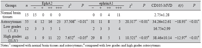 EphA2 、ephrinA1、CD105蛋白阳性染色主 要定位于细胞质和细胞膜,呈棕黄色或棕褐色颗 粒,核不着色,见图 1。星形细胞瘤组织内微 血管内皮细胞尚存在少量EphA2的表达。它们的 表达与患者性别、年龄及胶质瘤位置无明显相 关性(P>0.05),与星形细胞瘤病理分级明显相关 (P<0.05),见表 1。其中EphA2在星形细胞瘤的阳 性表达率(51/55)明显高于正常脑组织,差异有统 计学意义(P<0.01);且随着星形细胞瘤恶性程度增 加,表达逐渐增强,高级别星形细胞瘤组(Ⅲ~Ⅳ) 中EphA2 、CD105-MVD两者表达显著高于低级 别组(Ⅰ~Ⅱ级),差异有统计学意义(P<0.01),见 表 2、图 1。ephrinA1则具有相反的趋势,在正常 组织中呈阳性表达,在大多数星形细胞瘤中呈阴 性或弱阳性(+)表达且恶性程度越高,表达水平 越低,见表 2、图 2。CD105-MVD在脑星形细胞瘤 组表达均值(34.26±12.61)明显高于正常脑组织组 (2.75±1.28),差异有统计学意义(P<0.01);且高 级别星形细胞瘤组CD105-MVD的表达值(38.46 ±10.14)明显高于低级别星形细胞瘤组(16.75± 2.99),差异有统计学意义(P<0.01),见表 2、 图 3。当EphA2阳性表达及ephrinA1阴性表达增强 时,星形细胞瘤组织的CD105-MVD值也逐渐增加, CD105-MVD在EphA2表达阳性的星形细胞瘤组织 中表达均值(35.72±11.97)明显高于EphA2表达 阴性的星形细胞瘤组(17.60±6.58),差异显著 (P<0.01);但CD105-MVD在ephrinA1表达阳性 的星形细胞瘤组表达均值(25.80±8.93)却明显 低于ephrinA1表达阴性的星形细胞瘤组(39.19± 10.20),差异有统计学意义(P<0.05)。