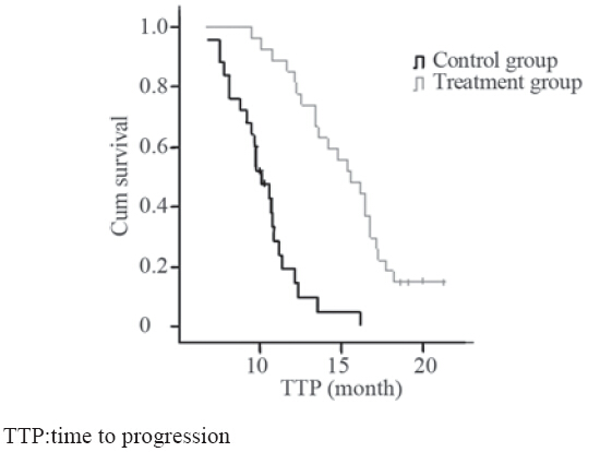 图 4 Kaplan-Meier分析治疗组和对照组患者无进展生存时 间曲线 Figure 4 Kaplan-Meier progression-free survival curves of treatment group and control group |