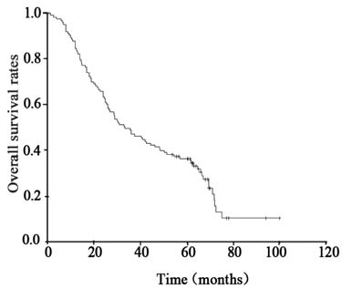 图 1 123例食管癌患者总生存率曲线图 Figure 1 Overall survival curve of 123 esophageal carcinoma patients |
