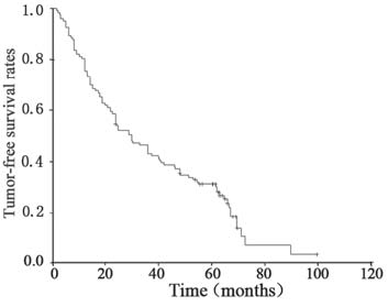 图 2 123例食管癌患者无瘤生存率曲线图 Figure 2 Tumor-free survival curve of 123 esophageal carcinoma patients |