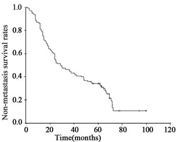 图 3 123例食管癌患者无远处转移生存率曲线图 Figure 3 Non-metastasis survival curve of 123 esophageal carcinoma patients |