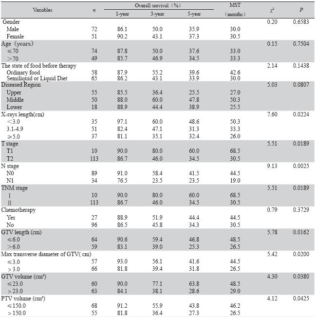表 1 123例食管癌患者单因素分析结果 Table 1 Univariate analysis of 123 esophageal carcinoma patients |