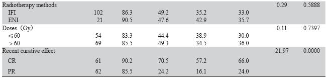 采用SPSS11.5统计软件进行统计分析,组间 比较应用卡方检验;单因素分析应用Kaplan-Meier 法,并用双尾的Log rank法进行显著性检验;多 因素分析采用Cox比例风险模型,并用Backward Wald筛选法评估独立的预后因素,P<0.05为差异 有统计学意义。 2 结果 2.1 放疗疗效