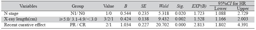 单因素分析结果显示患者病变X线长度、临床 T分期、N分期、TNM分期、GTV长度、GTV最大 横径、GTV体积及近期疗效显著影响患者生存率。 多因素分析结果显示患者病变X线长度、N分期及 近期疗效为独立性预后影响因素,见表 1、2。