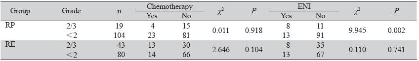 本组123例患者发生2级和3级急性放射性 肺炎(acute radiation pneumonitis,RP)共19 例(15.5%);发生2级和3级急性放射性食管 炎(acute radiation esophagitis,RE)共43例 (34.9%)。行化疗的27例患者中发生2级和3级 急性RP和急性RE率均较高,但差异无统计学意 义。行ENI的21例患者中发生2级和3级急性RP 有8例(38.1%),与未行ENI相比差异有统计 学意义;ENI患者中发生2级和3级急性RE有8例 (38.1%),与未行ENI组相比差异无统计学意 义,见表 3。