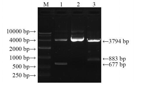 体经KpnⅠ、NheⅠ酶切,切下约3 794 bp与883 bp
