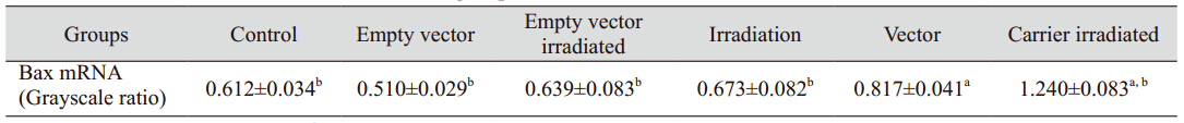 表 1、2,各载体组及载体照射组Bax基因转录及蛋