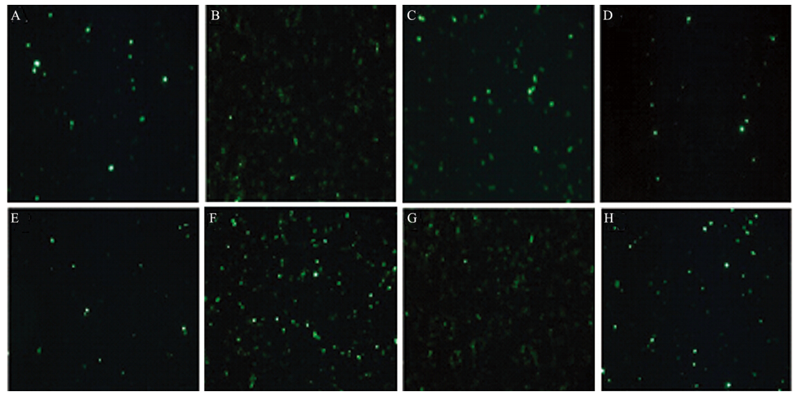 A-D:Fluorescence microscopy detection of SKT11 gene expression after A549 cells transfected with pEGFP-STK11 for 12,24,48 and 72h, respectively;E-H:Fluorescence microscopy detection of SKT11 gene expression after H460 cells transfected with pEGFP-STK11 for 12,24, 48 and 72 h, respectively