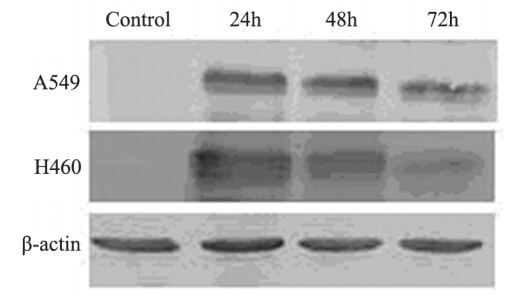 A549细胞和H460细胞在转染后各时间点,荧 光显微镜下均可见pEGFP-STK11重组质粒组细胞 呈绿色,细胞形态完好,在转染后24 h EGFP表达 最强,见图 2;0.9%氯化钠溶液对照组细胞在转染 后各时间点,荧光显微镜下均未观察到绿色荧光。 在转染后各时间点,Western blot检测结果均 显示与目的蛋白分子量一致的目的条带,24 h时条 带颜色最深;而0.9%氯化钠溶液对照组未见目的 条带表达,见图 3。