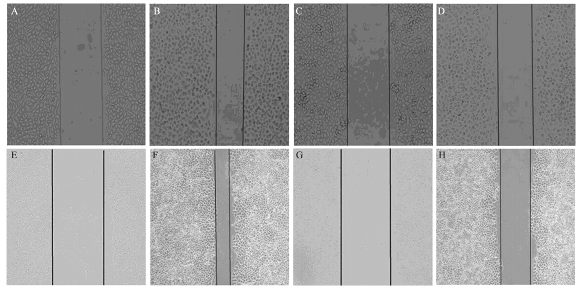 A,B: wound closure of A549 cells in 0.9%NaCl control group after 0 and 48 h; C,D: wound closure of A549 cells in pEGFP-STK11 group after 0 and 48 h; E,F: wound closure of H460 cells in 0.9%NaCl control group after 0 and 48 h; G,H: wound closure of H460cells in pEGFP-STK11group after 0 and 48 h, respectively