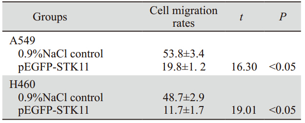 与划痕后即刻测量相比,各组细胞在划痕后48 h,划痕距离均明显缩小,有融合的趋势,见图 4。两种细胞均显示pEGFP-STK1重组质粒转染组 划痕较0.9%氯化钠溶液对照组细胞愈合慢,转染 组细胞迁移率小于0.9%氯化钠溶液对照组,差异 有统计学意义(P<0.05),且H460细胞迁移率小 于A549细胞,见表 1。