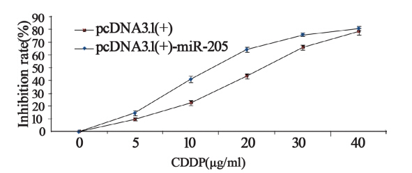 应用SPSS 13.0统计软件进行统计分析,计量数 据用均数±标准差(x±s)表示,两个样本均数之间 的比较采用t检验,P<0.05为差异有统计学意义。 2 结果 2.1 miR-205对细胞的CDDP药物敏感度的影响