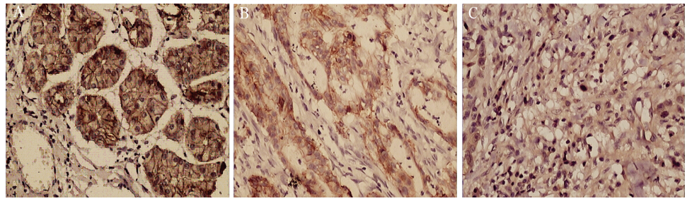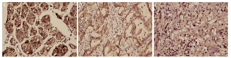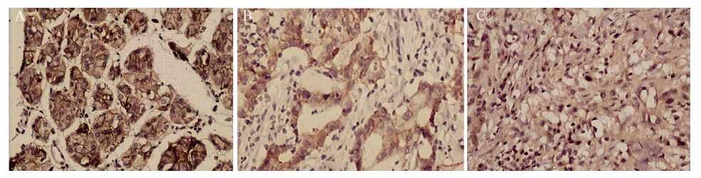A:strong positive expression in normal gastric mucosa;B:positive expression in well-and moderately-differentiated gastric carcinoma; C: negative expression in poorly-differentiated gastric carcinoma