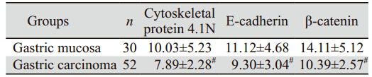 表 1 细胞骨架蛋白4.1N、E-cadherin和β-catenin 在癌旁胃黏膜和胃癌组织中的表达(x±s) Table 1 The expression of cytoskeletal protein 4.1N, E-cadherin and β-catenin in gastric mucosa and gastric carcinoma(x±s) |