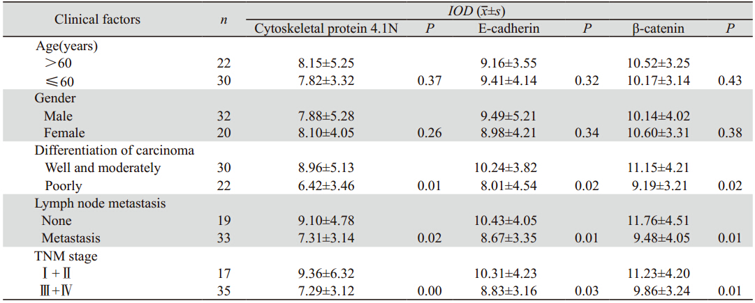 表 2 细胞骨架蛋白4.1N、E-cadherin、β-catenin在胃癌组织中的表达及与临床生物学特性的关系(x±s) Table 2 Relationship between the expression of cytoskeletal protein 4.1N,E-cadherin,β-catenin and clinic biological characteristics of gastric carcinoma(x±s) |