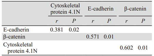 细胞骨架蛋白4.1N与E-cadherin之间的表达呈正 相关(r=0.381,P<0.05),与β-catenin之间的表达呈正 相关(r=0.602,P<0.05)。E-cadherin与β-catenin之间 的表达呈正相关(r=0.571,P<0.05),见表 3。