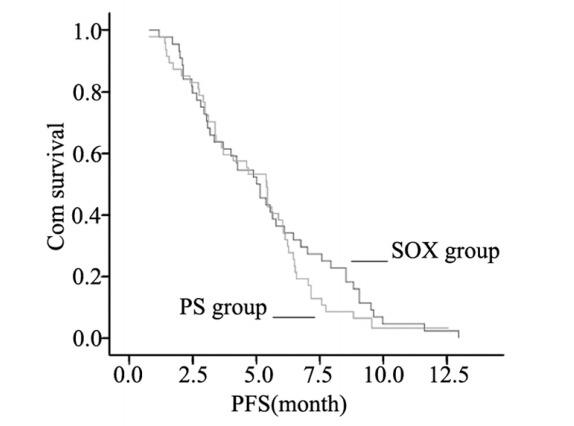 图1 SOX组与PS组患者PFS曲线 Figure 1 PFS curves of SOX group and PS group |